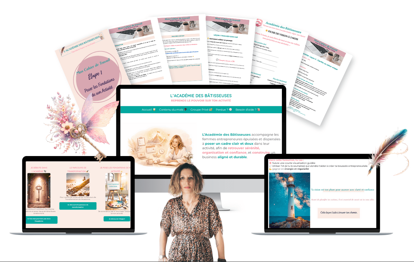 l’Académie est faite pour les femmes entrepreneures comme toi : créatives, ambitieuses, parfois débordées, qui veulent structurer leur business sans s’épuiser.